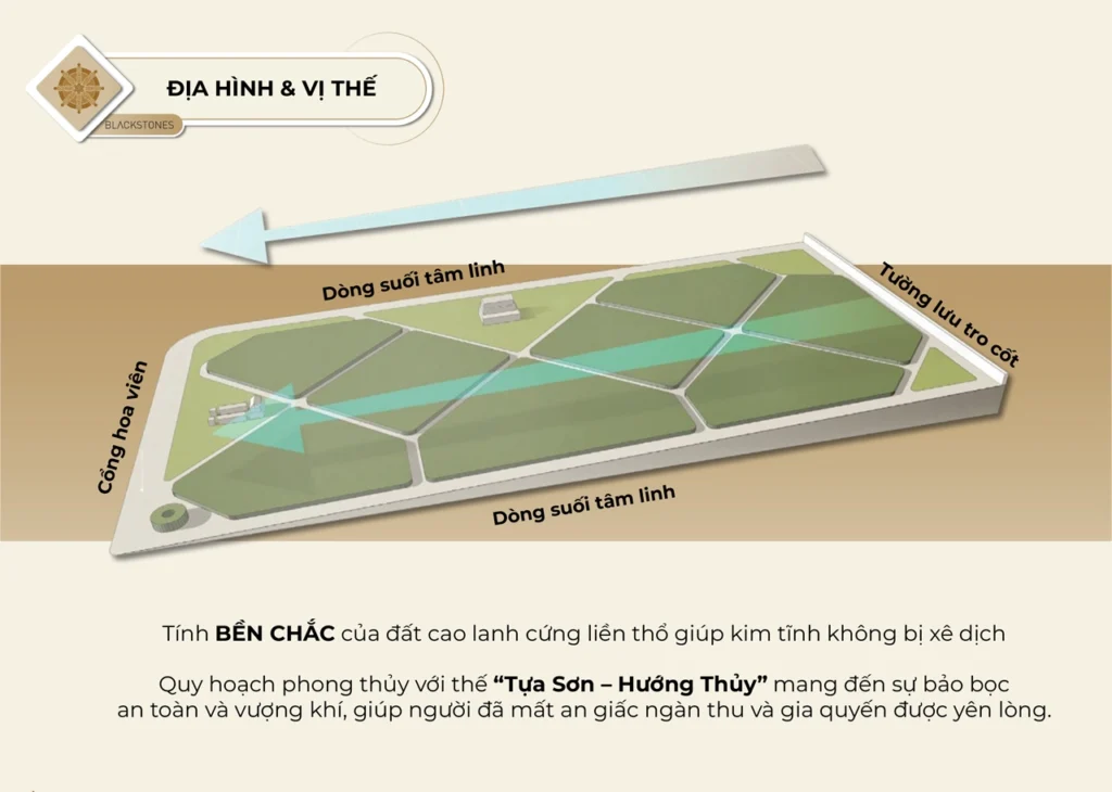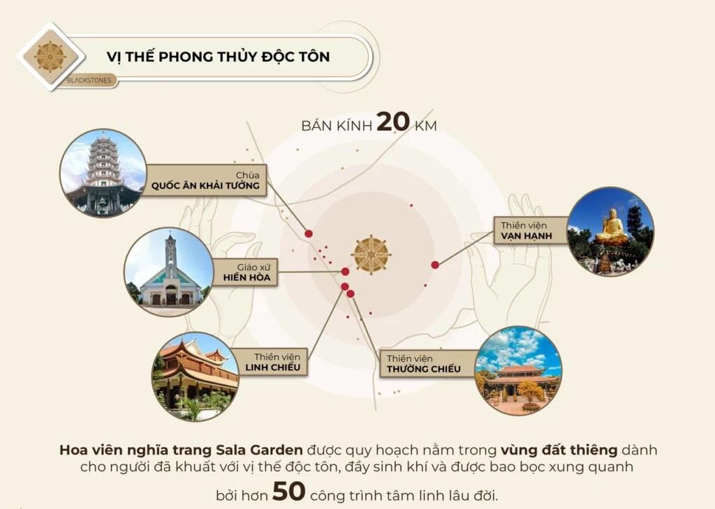 Được bao quanh bởi 50 ngôi chùa, thiền viện, giáo sứ lớn, có lịch sử trăm năm tạo nên một vị thế phong thủy độc tôn mà không nghĩa trang nào có được.