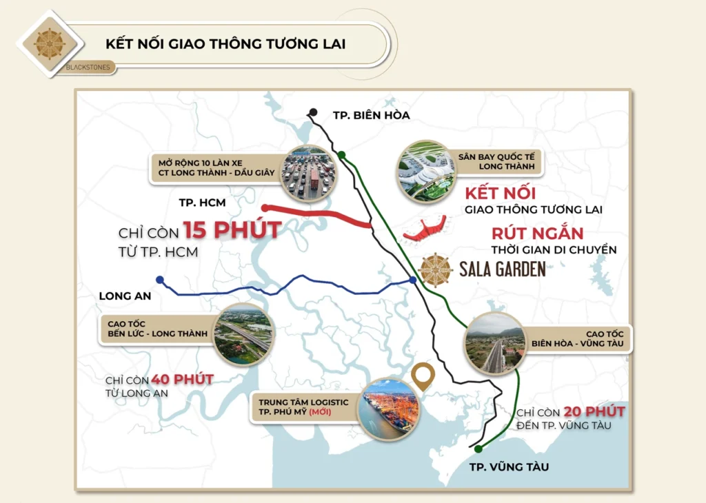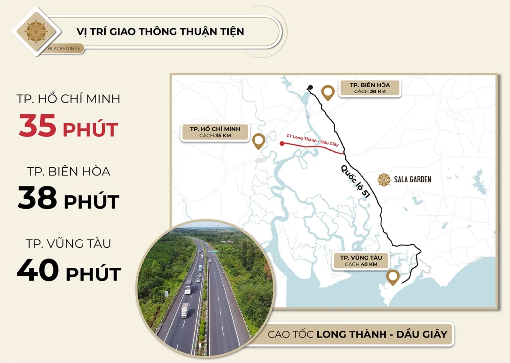 Giao thông kết nối thuận tiện khi chỉ cách sân bay Long Thành 10 phút và 35 phút lái xe từ TP.HCM thông qua cao tốc HCM – Long Thành và Quốc Lộ 51.