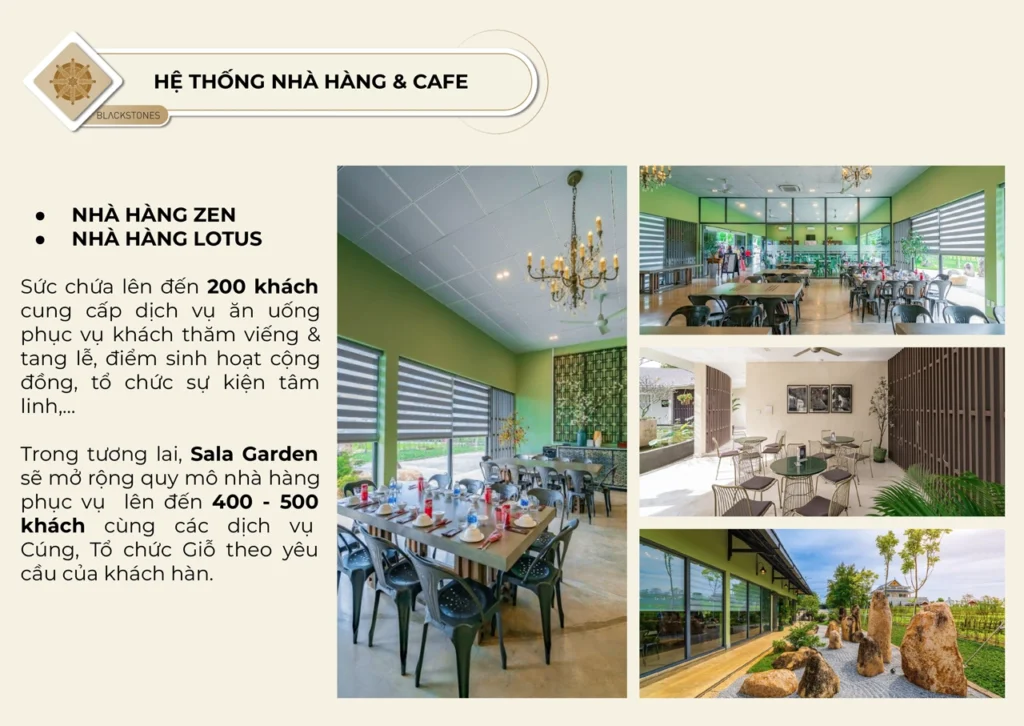 Sala Garden hiện được các chuyên gia nước ngoài từ Đài Loan, Malaysia, Nhật Bản tư vấn quản lý và vận hành. Hoa viên nghĩa trang Sala Garden cung cấp hệ thống dịch vụ trọn gói như tư vấn, tổ chức tang lễ, mai táng, hỏa táng, lưu tro cốt, chăm sóc phần mộ, tổ chức các nghi lễ, sự kiện tâm linh.